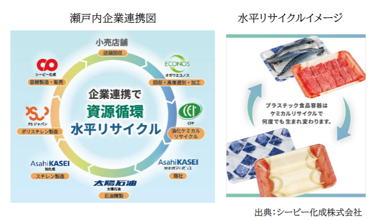 シーピー化成株式会社(本社:岡山県井原市、代表取締役:三宅慎太郎)は、使用済みプラスチック食品容器の回収、再資源化、再生原料化、成形、販売に携わる6社と連携し、スーパーマーケットの店頭で回収した使用済みプラスチック食品容器をケミカルリサイクルにより再資源化し、再びプラスチック食品容器として再生・活用する「瀬戸内資源循環プロジェクト」を共同で推進していきます。